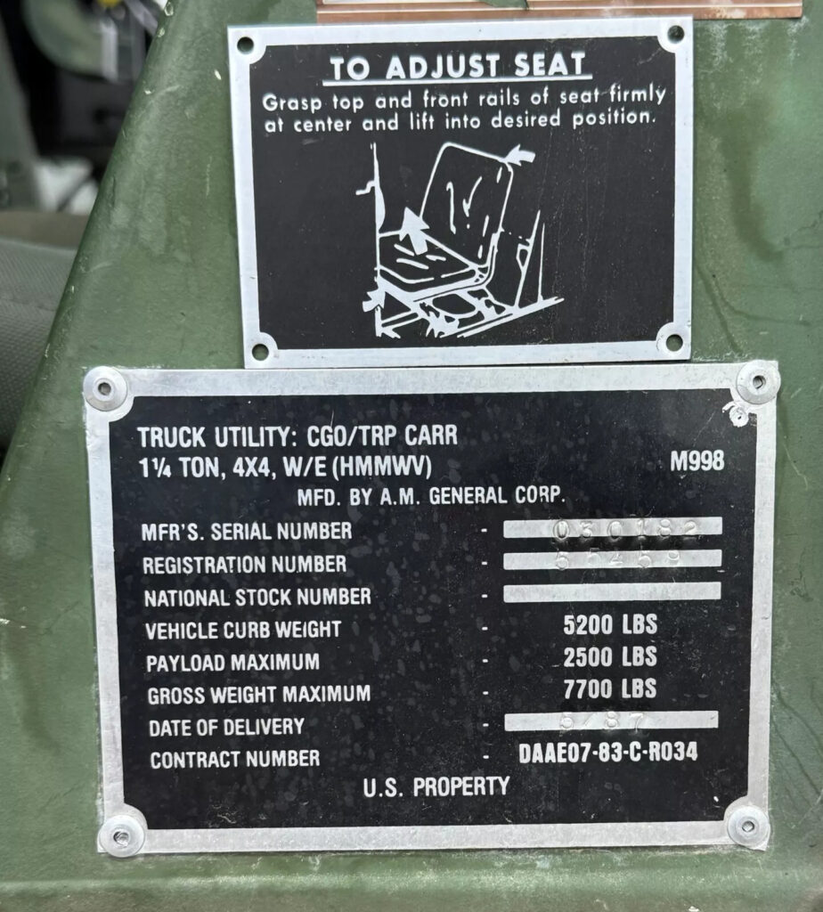 1986 American General M998 HMMWV S#030182 10,866 Miles DESERT STORM