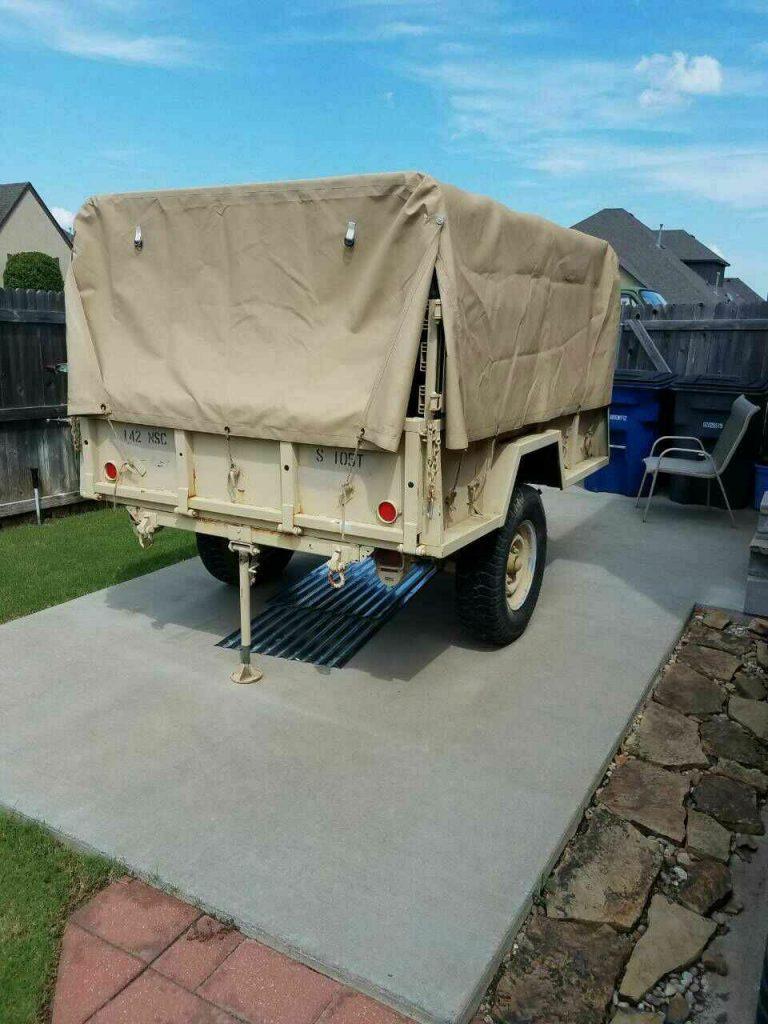 M101A2 trailer. Built for the truck. 8′ bed with bows and nice tarp. Nice tires, can haul 2000lb and has a dump bed. Has brakes and parking brakes. Commonly used for off-road camping trailers.