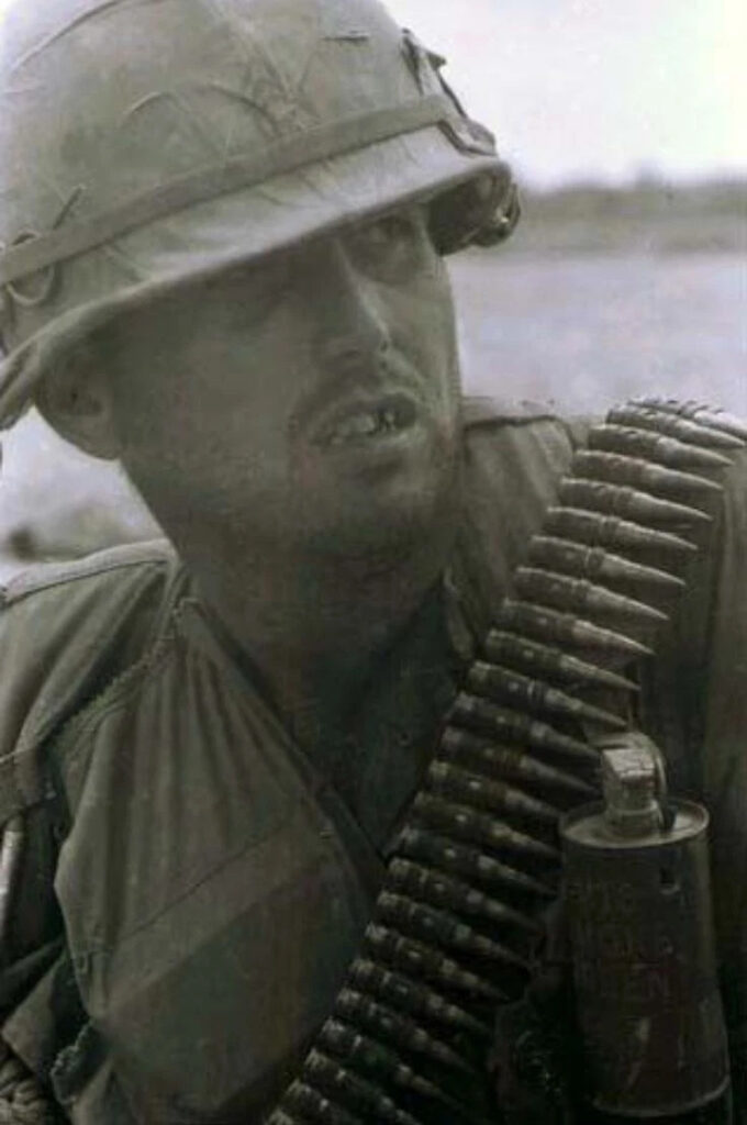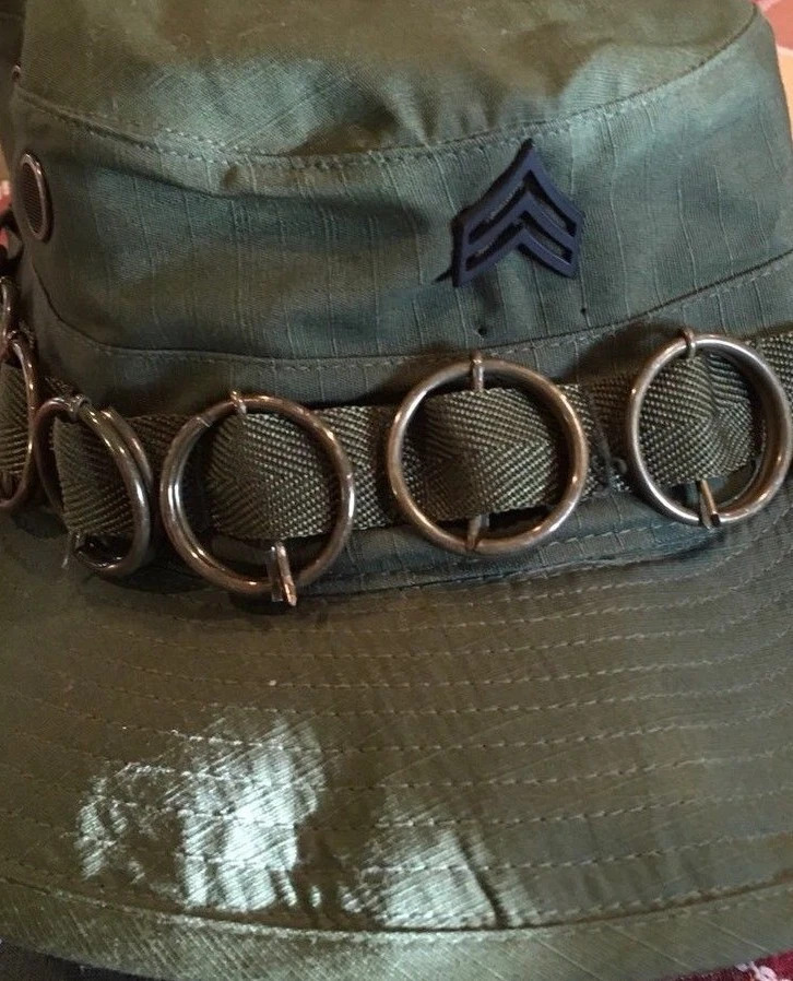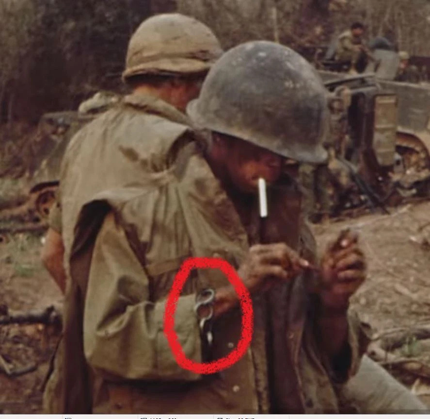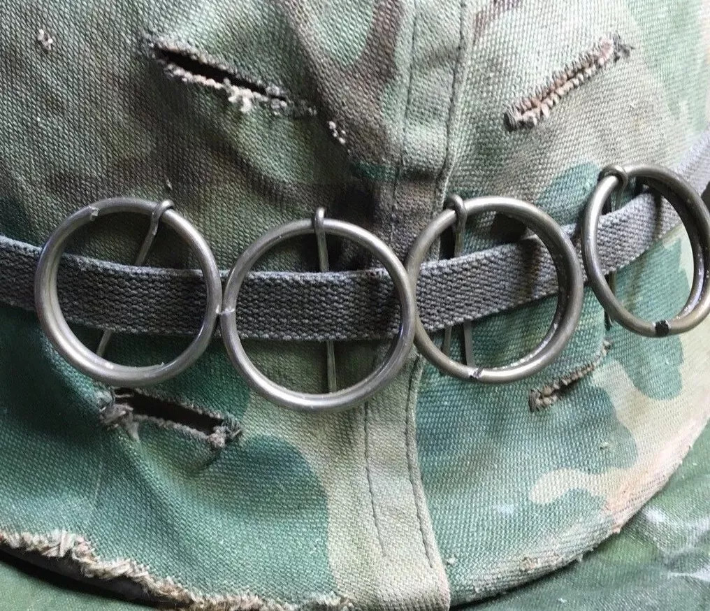 Many GIs would “enhance” the look of their helmets with a row of pulled rings from used smoke or frags. I found one picture of a GI who even made a bracelet from them… VERY Cool!!!