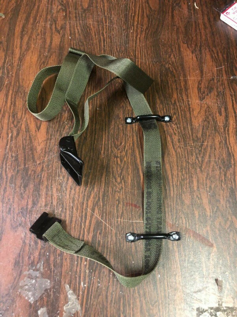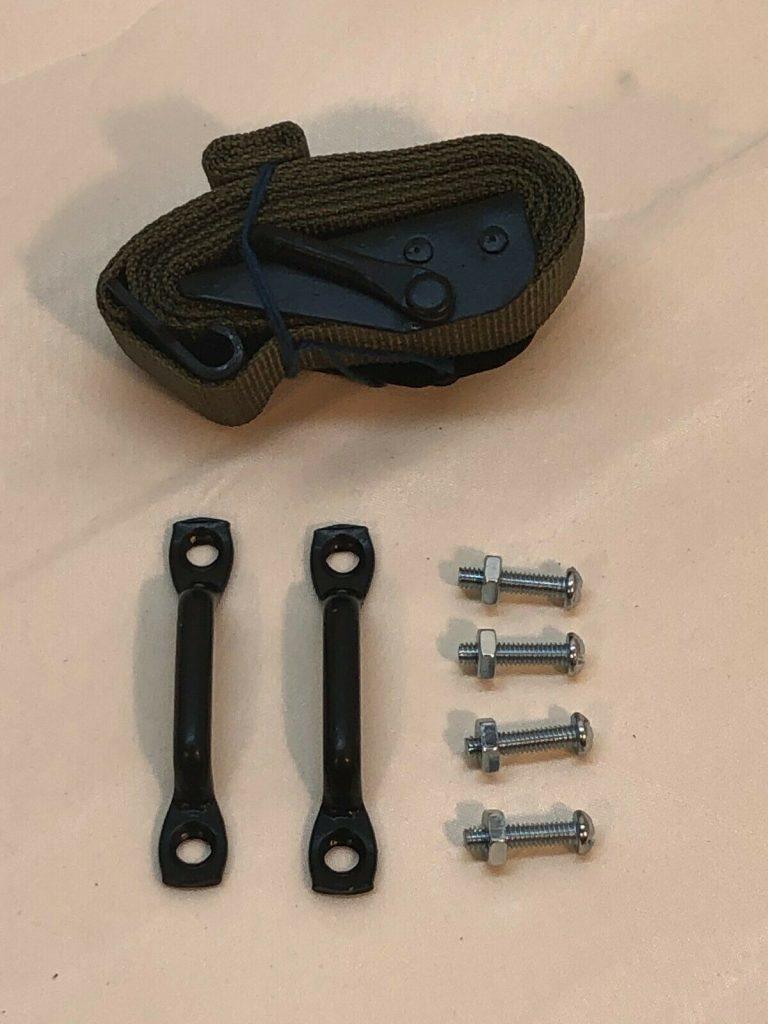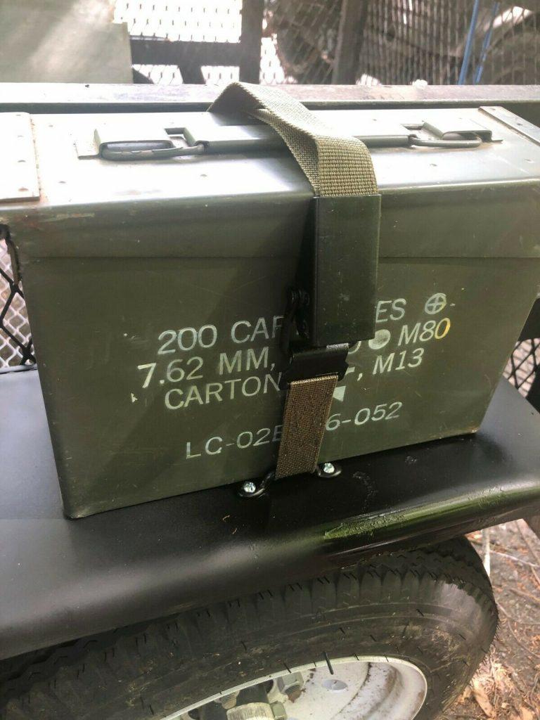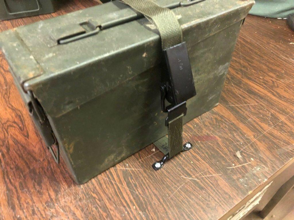 This is a tie down kit for a military ammo can, a tool box, gas can or any similar item to mount and carry them on your Jeep, Military truck, trailer, tractor, ATV or anything else you can imagine. It consists of of a military issue 52″ long nylon web strap with a steel cam-over buckle, two powder coated steel strap loops that mount to your vehicle or platform, and 4 1″ mounting bolts and hardware.