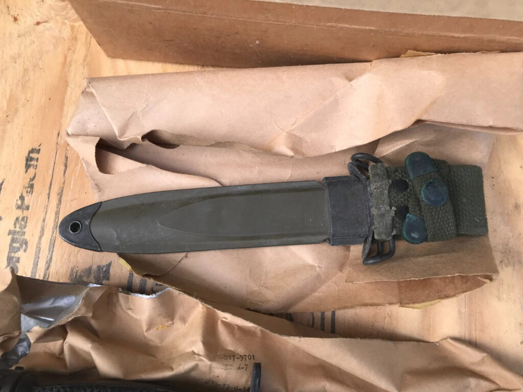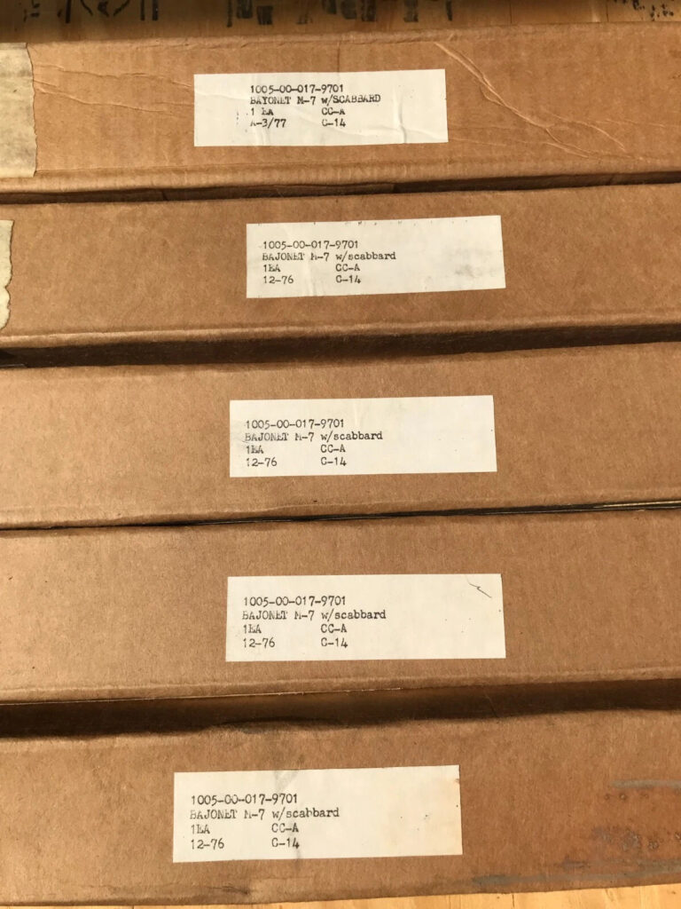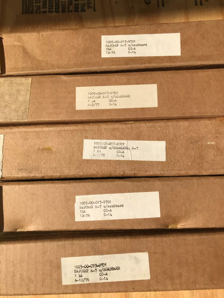 Up for sale are original MINT NOS Sealed in their original box M7 Knife and M8A1 Scabbard. The boxes are dated around 1976-1977 but inside plastic packaging that the knife and scabbard are sealed in dates to 1974-1975 during the Vietnam War. I opened one up so you can see what is inside. The one you will receive is sealed in the original box, never opened for nearly the past 50 years, and manufacturers can vary. The one I opened was BOC but what you get could be different. If you open the box which is sealed, there are no returns on this item as you will be altering the item sold. Please ask questions before bidding and look at pictures. I will combine shipping of bayonets into one box.