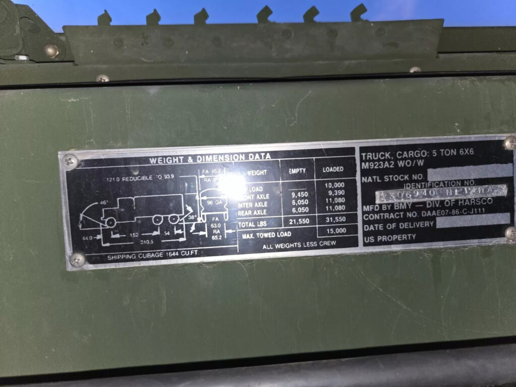 Discover the robustness of the BMY M923A2 Military 5-Ton Cargo Truck, a vehicle renowned for its durability and versatility. Equipped to meet the demanding needs of military operations, this truck is an emblem of reliability. It has a Cummins turbo diesel engine, Allison automatic transmission, and Rockwell axles. Originating from a 1992 manufacturing year, the M923A2 model boasts a history of performance under adverse conditions, making it a staple for logistical support. In tandem with the cargo truck, the M989A1 Heavy Expanded Mobility Ammunition trailer ensures the secure transport of critical ammunition and equipment, or anything you want to have a soft ride on rough roads. Designed to complement the M923A2, this trailer enhances the efficiency of military supply chains, offering an additional layer of protection and mobility. Together, they form a formidable duo on the battlefield.