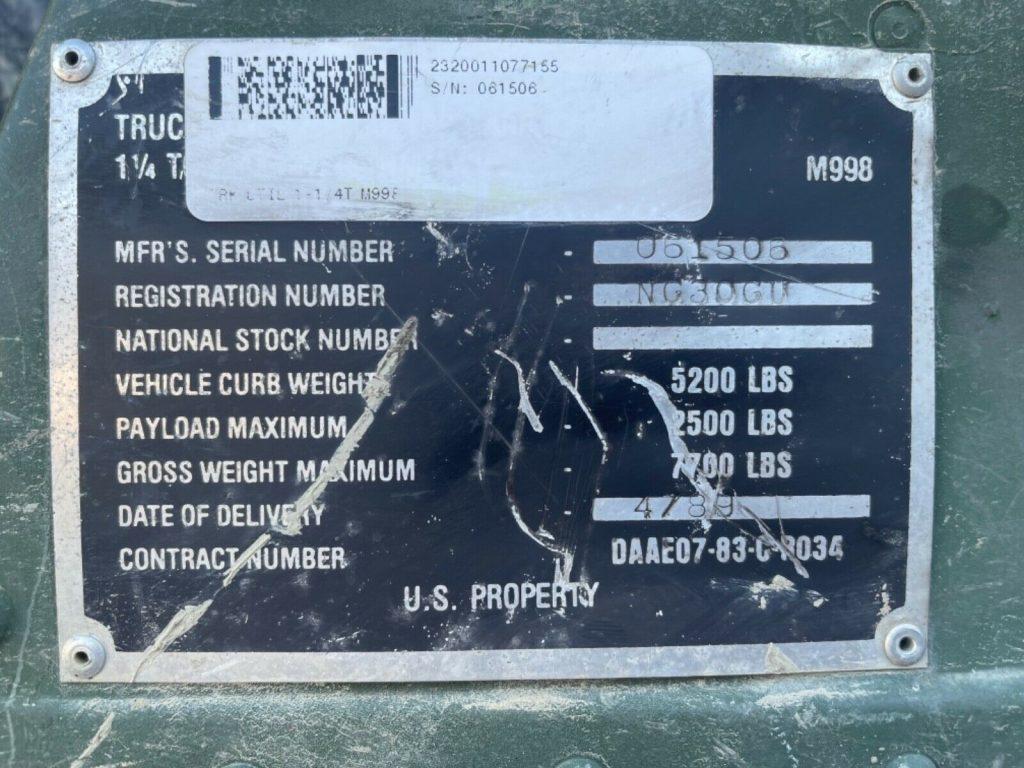M998 hmmwv automatic diesel 4×4 four door soft top truck/wagon back, comes with four soft doors I have the soft piece that buttons to the roof and down to floor to make it a 4 door truck…runs drives good! Fresh service all oils changed and filters New brakes, new optima gel yellow top batteries also had 24v solar battery tender on hood that works great new glow plug control module new flasher module new signal switch watchdog security fog for ignition jeep seats 43×14.50×20 tsl’s on 20” fuel wheels also have original wheels and tires 90% tread like new … 1”leveling kit new axles new rearend new water temp sensor if someone wanted factory wheels and hood I can swap them I have a complete camo hood that’s ready to bolt on also have new axles brakes mirrors with brackets radio equipment lost of new and good used parts that go with unit comes with clean and clear Tennessee title PayPal or money order excepted as payment