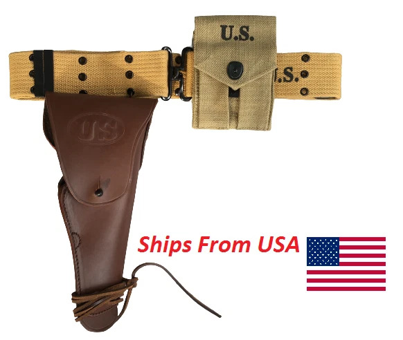 Original WWII M1936 Webbing Canvas Pistol Belt with M1911 Colt Holster and .45 Colt Magazine PouchDESCRIPTION : This M1936 Pistol Belt is a WWII reproduction with U.S. marking. The belt is adjustable and comes in 2 sizes. This belt is sometimes commonly called a web belt. 3 holes just match original item and you can hook your 1911 pistol holster or X strap and first aid pouch or magazine pouch etc to it as shown in picture.