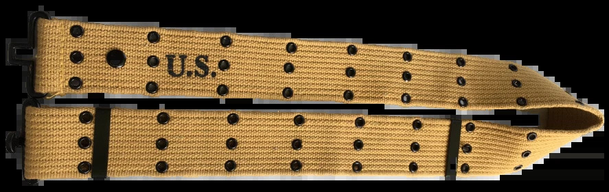 Three rows of metal eyelet’s, the top row is to attach to the M36 suspenders, the middle row allows the belt to be adjusted in size, and the bottom row allows pistol holsters and first aid pouches etc.