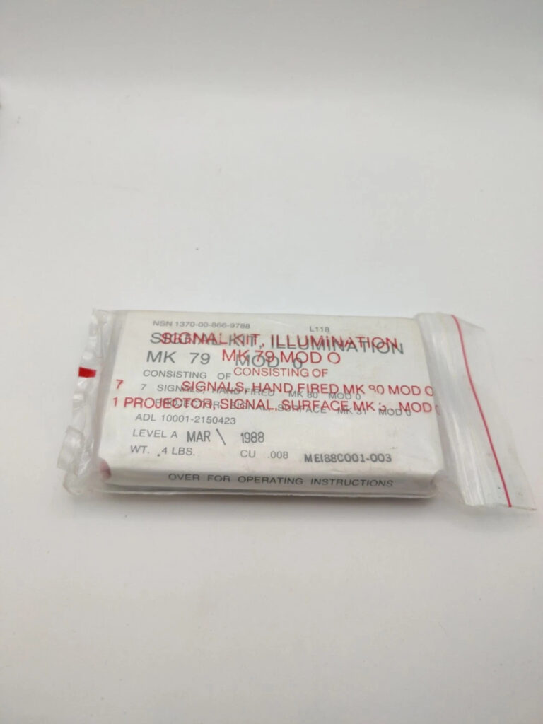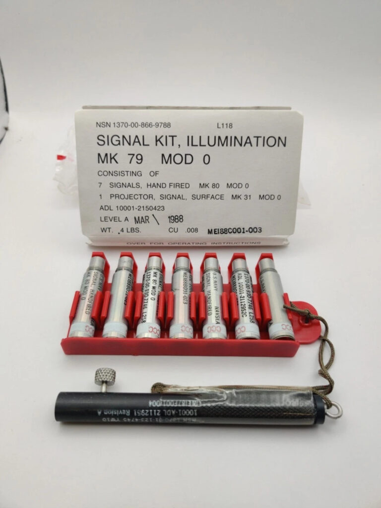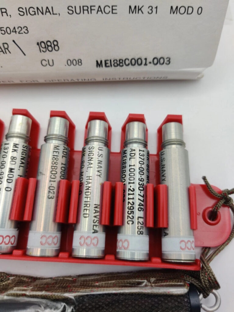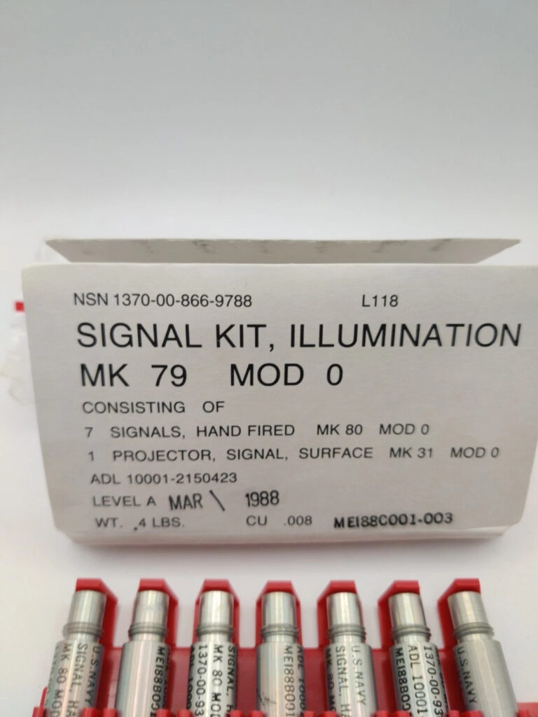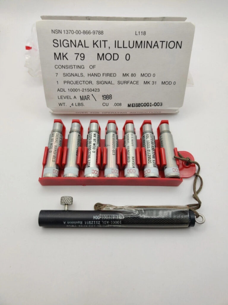 The Signal Kit, US Navy, MK79 Mod 2, illumination hand fired signal kit. March of 1988 is the date on them
