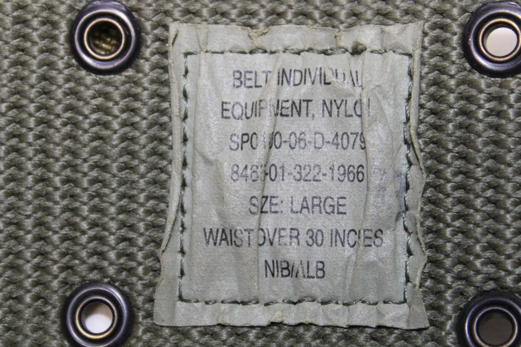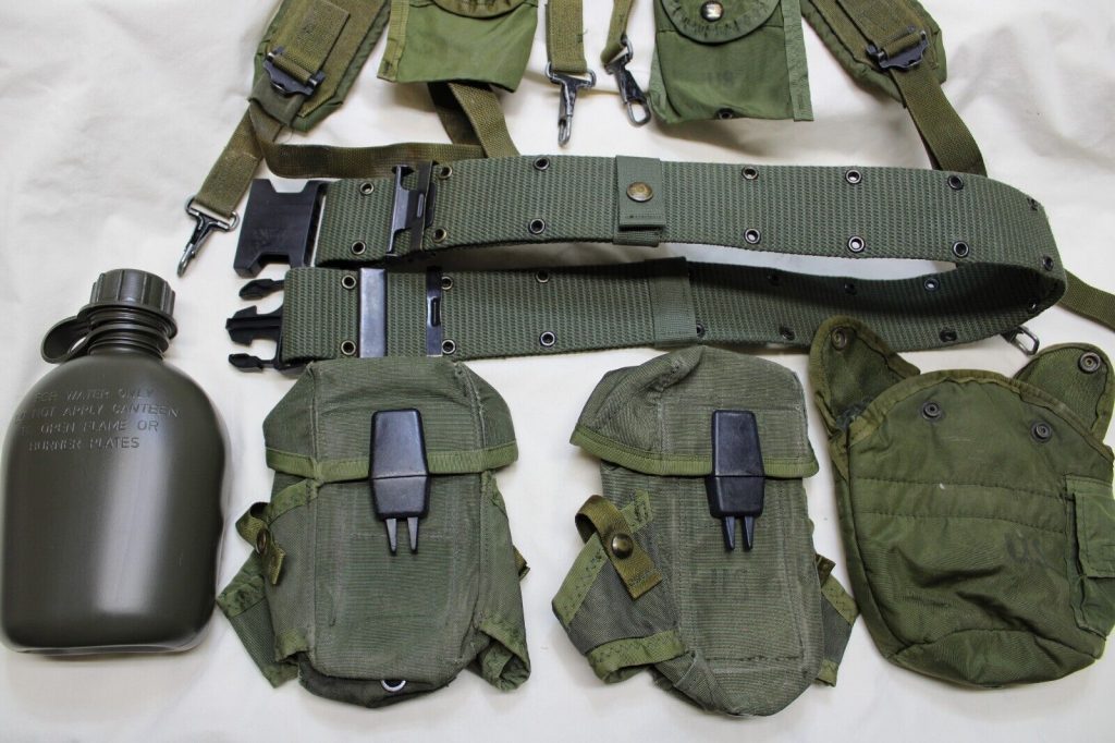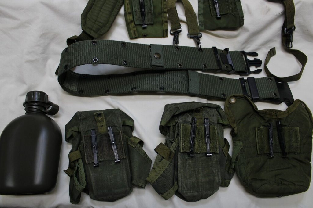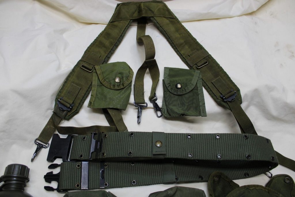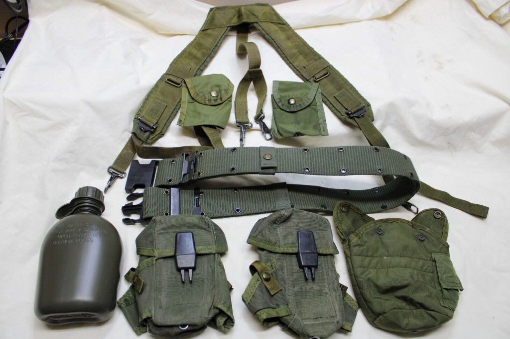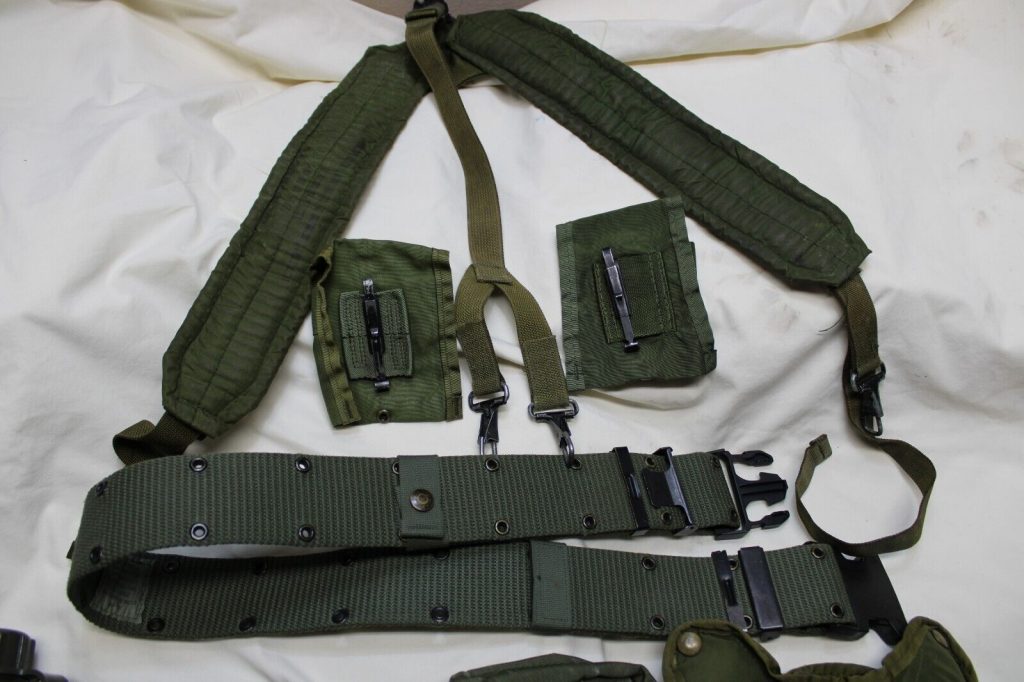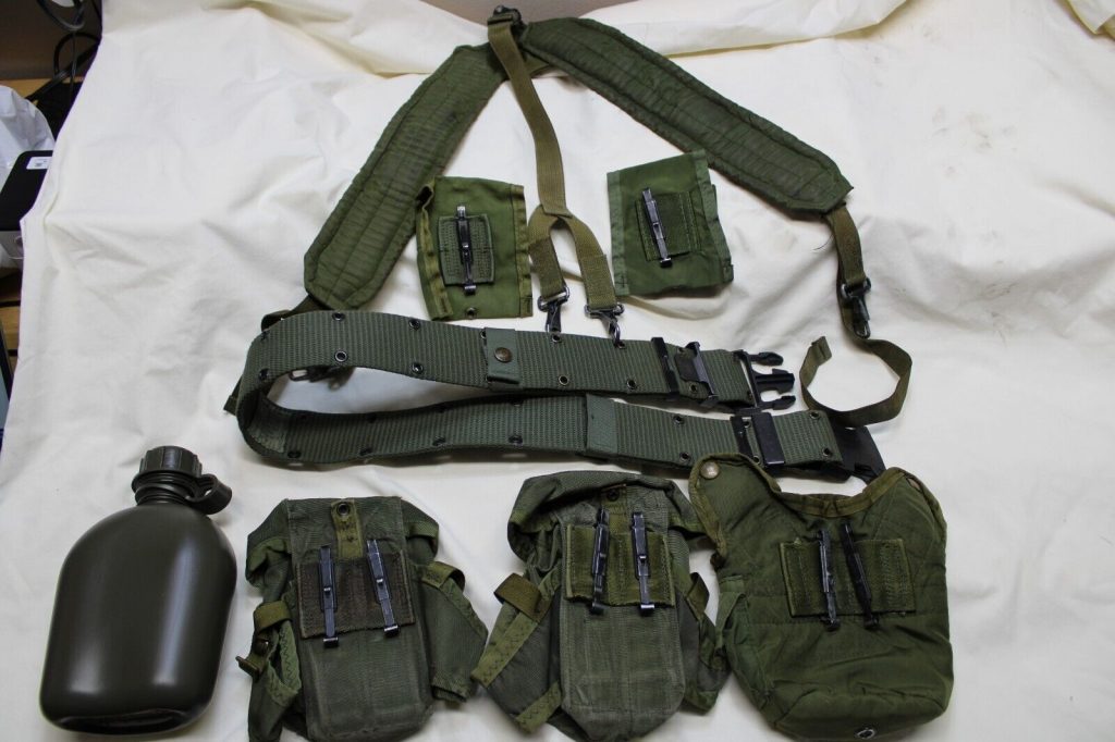 up for a buy now auction is a Lot of US Military Issue Field Gear. This is Alice field gear that was issued up until the late 1990’s. If you buy now, you will get everything pictured. Everything is made from nylon and is OD Green in color. This is a Large Set. The belt extends out to 50 inches. The Y suspenders are fully adjustable and are a 1 size fits most. The 2 ammo pouches were made to hold.223/5.56 Magazines. Or a can of pop or a cell phone. The canteen and cover are included. The water canteen is New. Also included are two first aid compass pouches. Everything is US Military Issue. This gear is what thy issue to US Forces fighting all over the world. The set is really well made and was made to survive a fight and carry the essentials to battle. Set does shows ware from use. On a couple pieces there may be a name or writing dirt rust residue frying tape residue or tape rust on the metal or corrosion. Each item is a little different but typical ware includes dirt, dust stains, fading rust, scratches. I have 10 of these sets available so items will vary from item to item. We will try are best to pick out the best items we have to send to you but know items will show some sort of ware from being issued. And will be used. Expect used items that show ware from use.