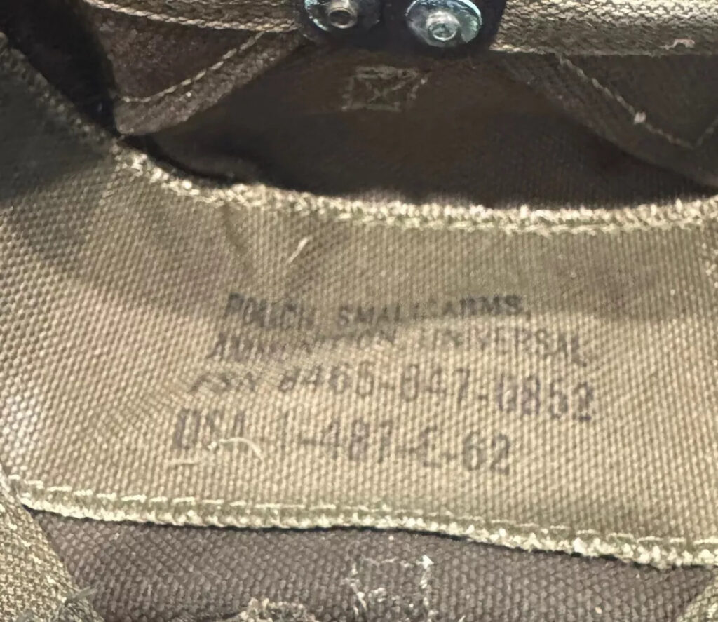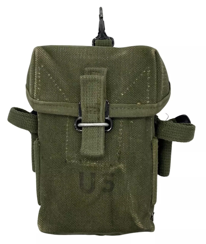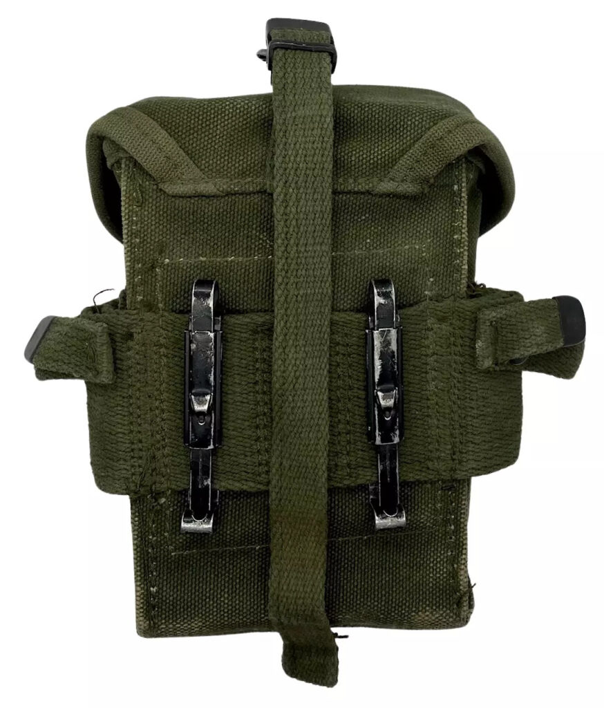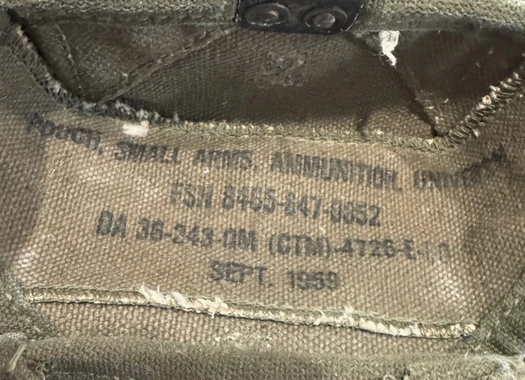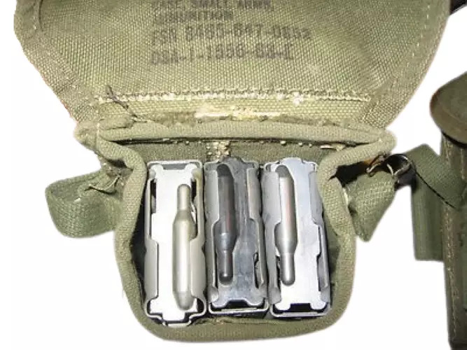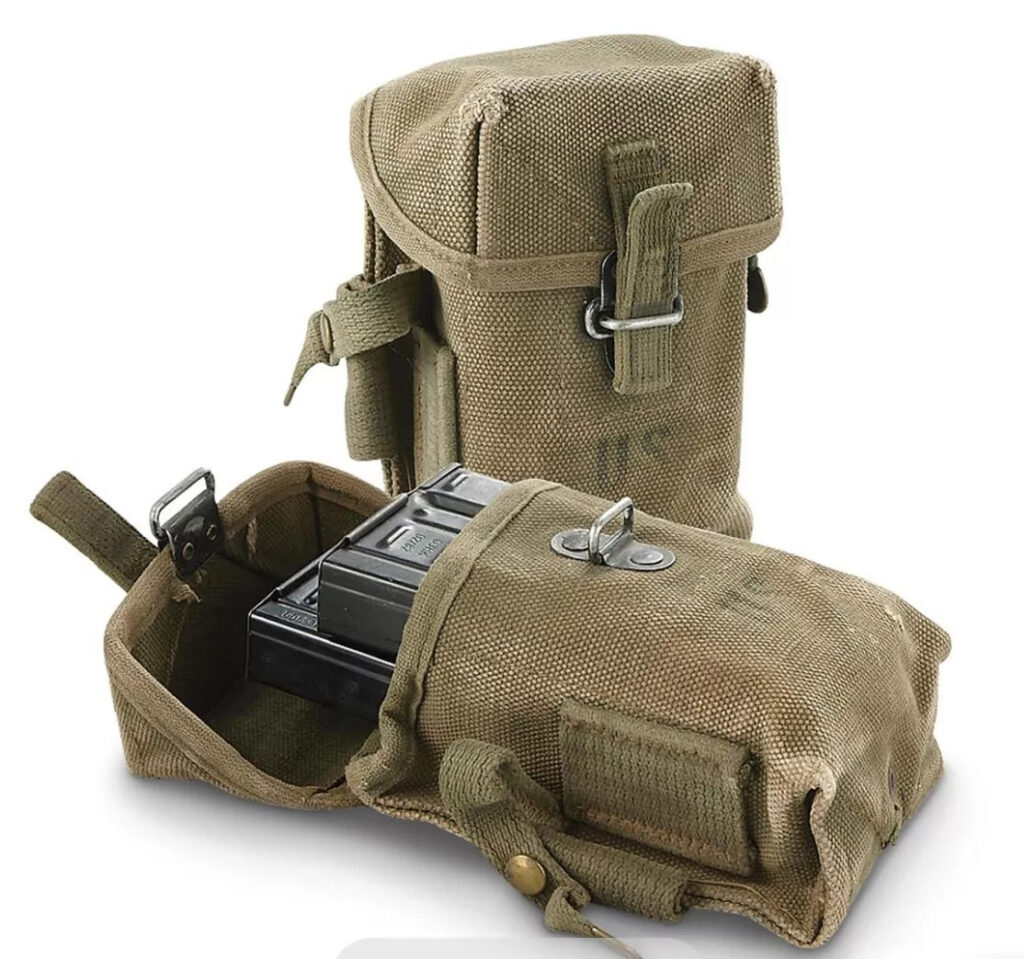 The pouch was designed with the intent to carry a variety of different magazines. It can hold six 8 round M1 clips, 2 BAR mags, three M14 20 round mags, four 30 round M2 carbine mags, and even three 40mm grenades.