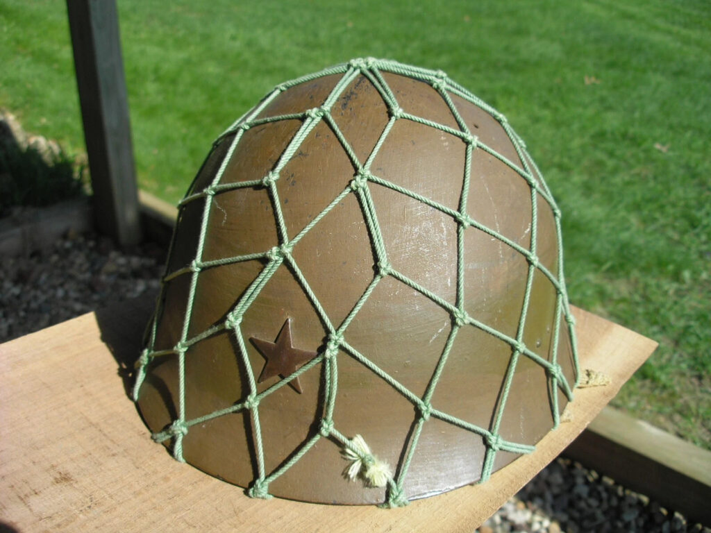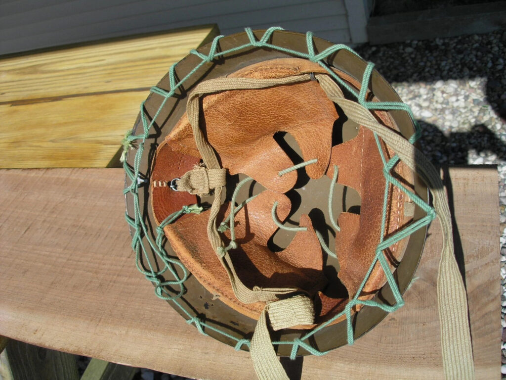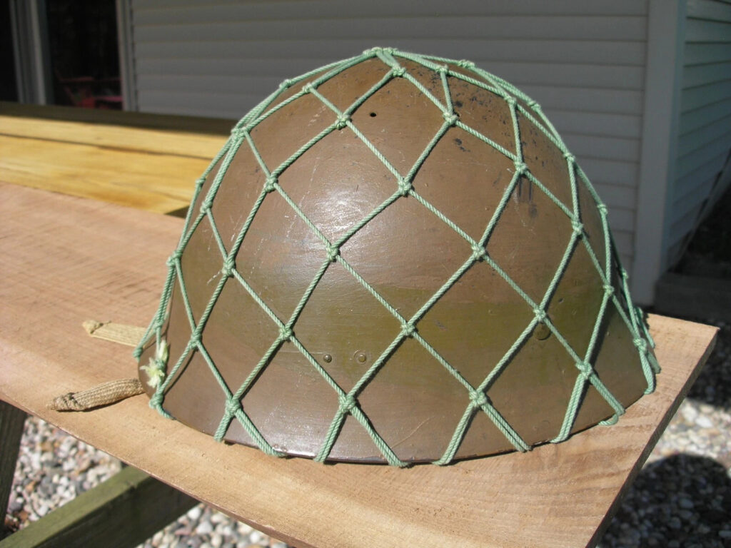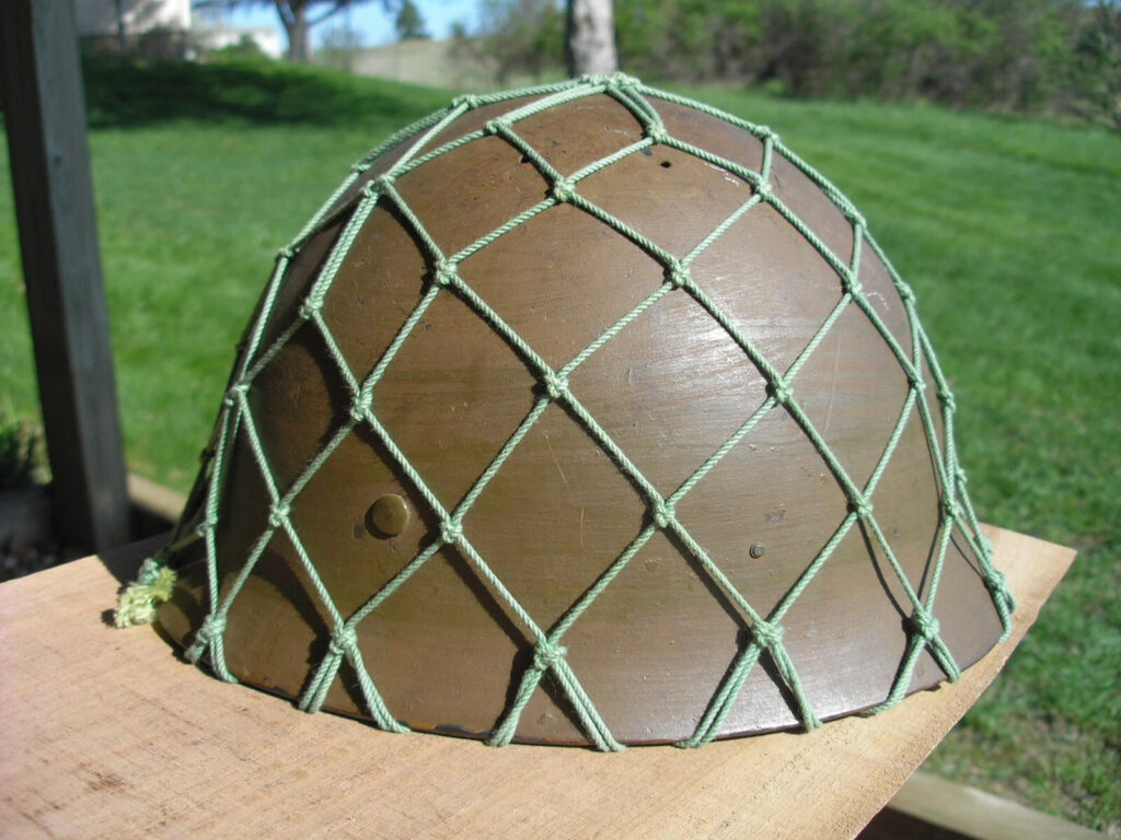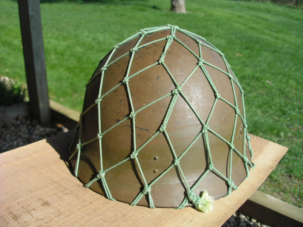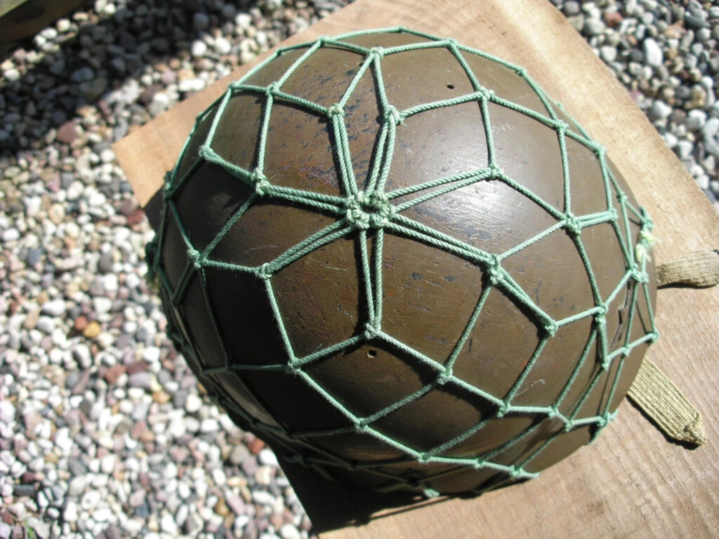 I did check the entire helmet over with my UV black light, nothing whatsoever glows under a UV black light, same for the net, no-glow, so no modern fabric components. Just a quick word on nets. Years back, I acquired this helmet with the Japan Army Navy camouflage net already on it. This is one of the nets with reinforced double rope at the edge. You can find these nets for sale on many militaria sites as original, but some collectors are saying these are very good copies some say even made with original material in the 1970’s – 1980’s in Japan by Nakata Shoten. The net displays on this helmet extremely well so I have left it in-place. Helmet would be a very good addition to any Pacific War / USMC Marines WW2 Collection.