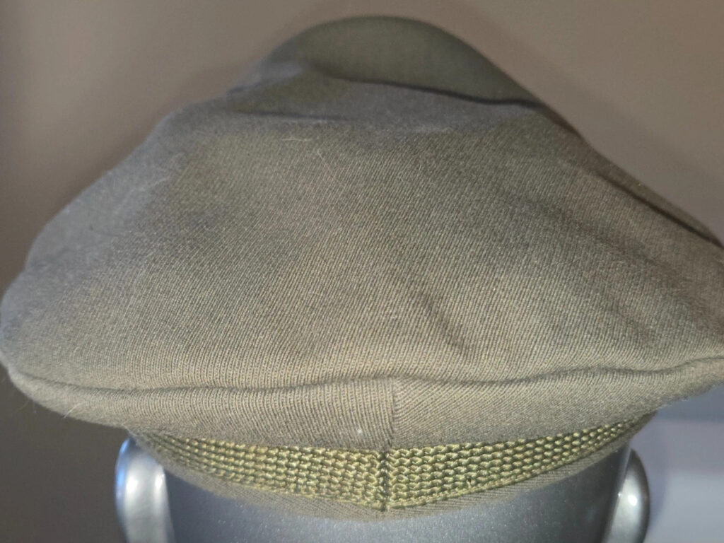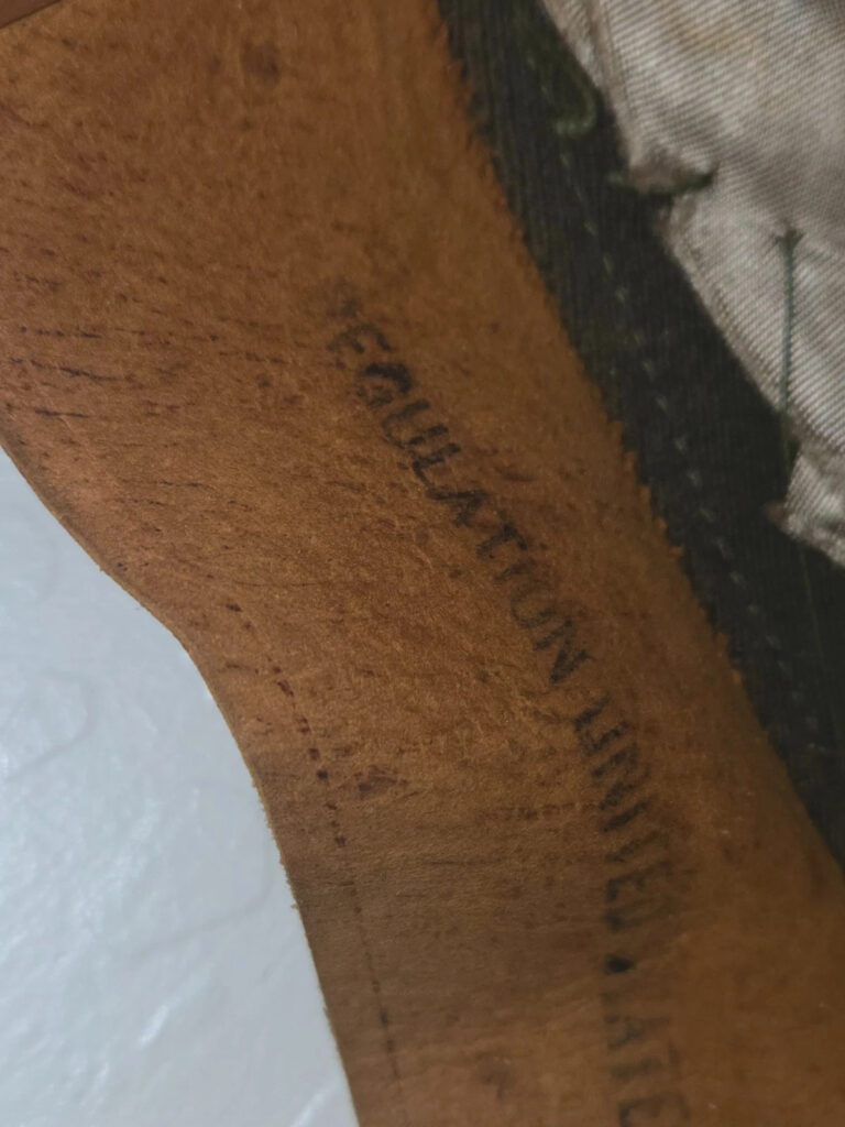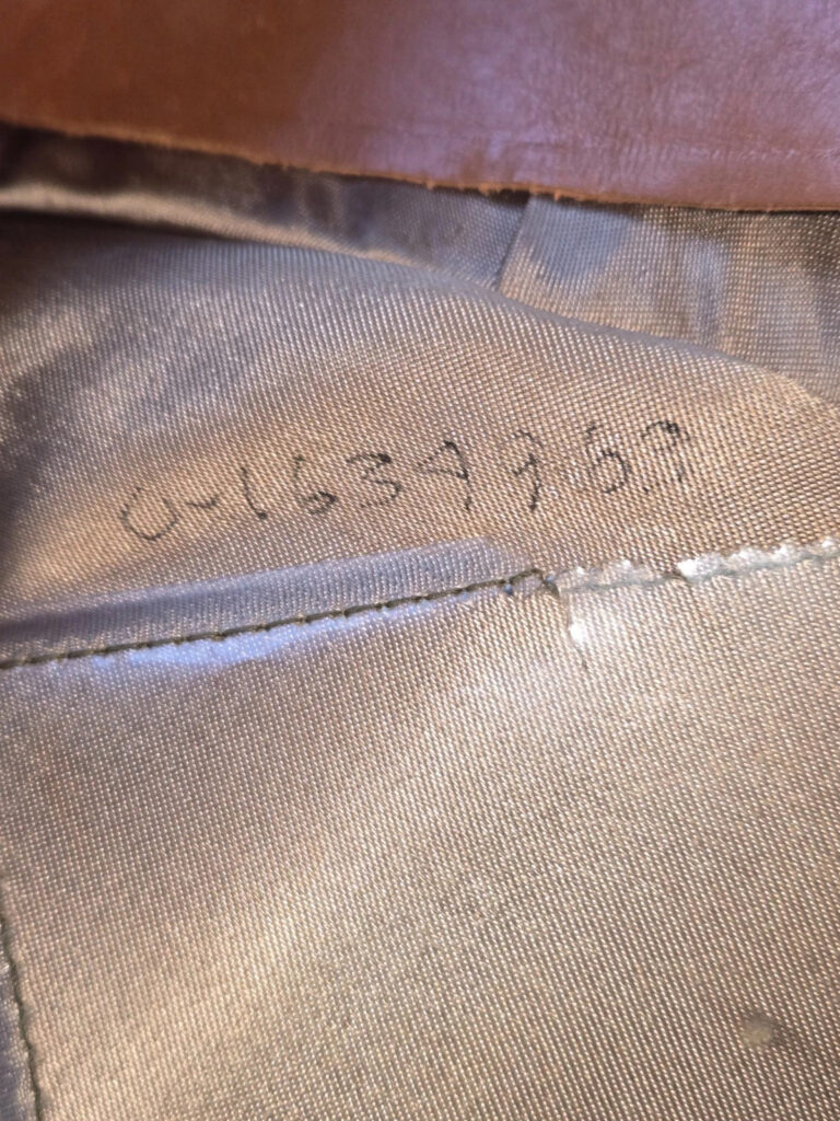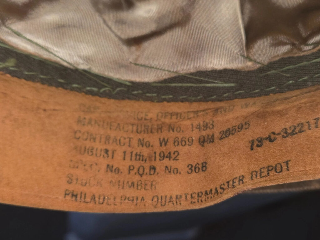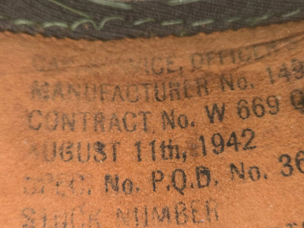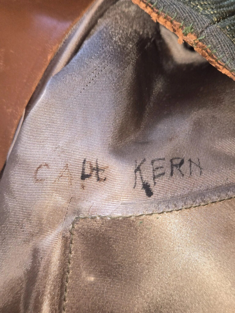 Named Crusher cap, manufacture date 1942 and attributed to B-17 navigator Lt. Kern (went on to Major General). The cap is labeled “Capt. Kern” in the crown, but inside the sweatband is “Lt. Kern”. Photos above show his B-17 “Revel’s Revenge” (sometimes noted as “Reuel’s Revenge”) and a photo of some of the POWs at Stalag Luft I near Barth Germany where he was taken. I’m not 100% on the attribution.