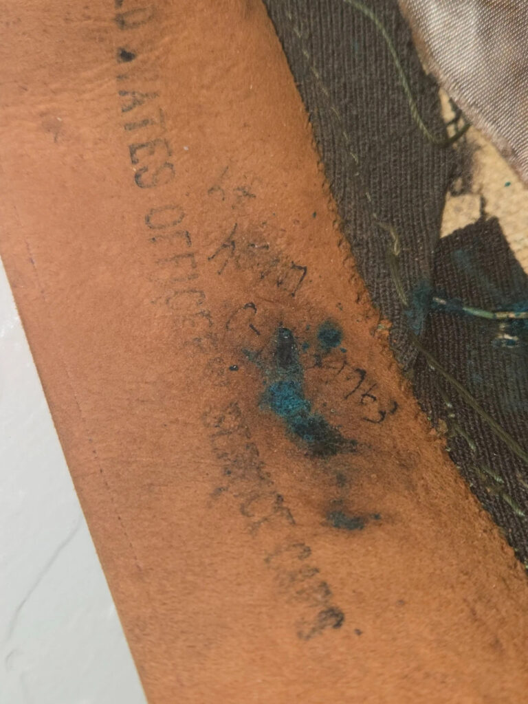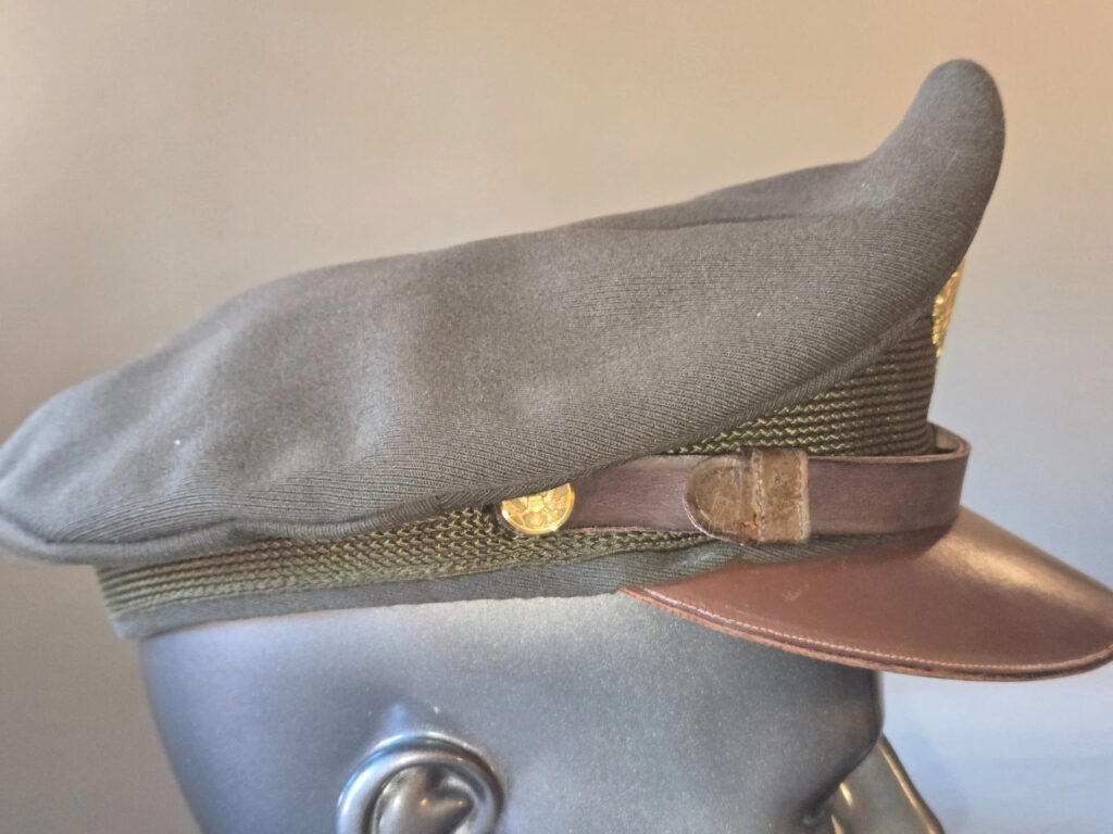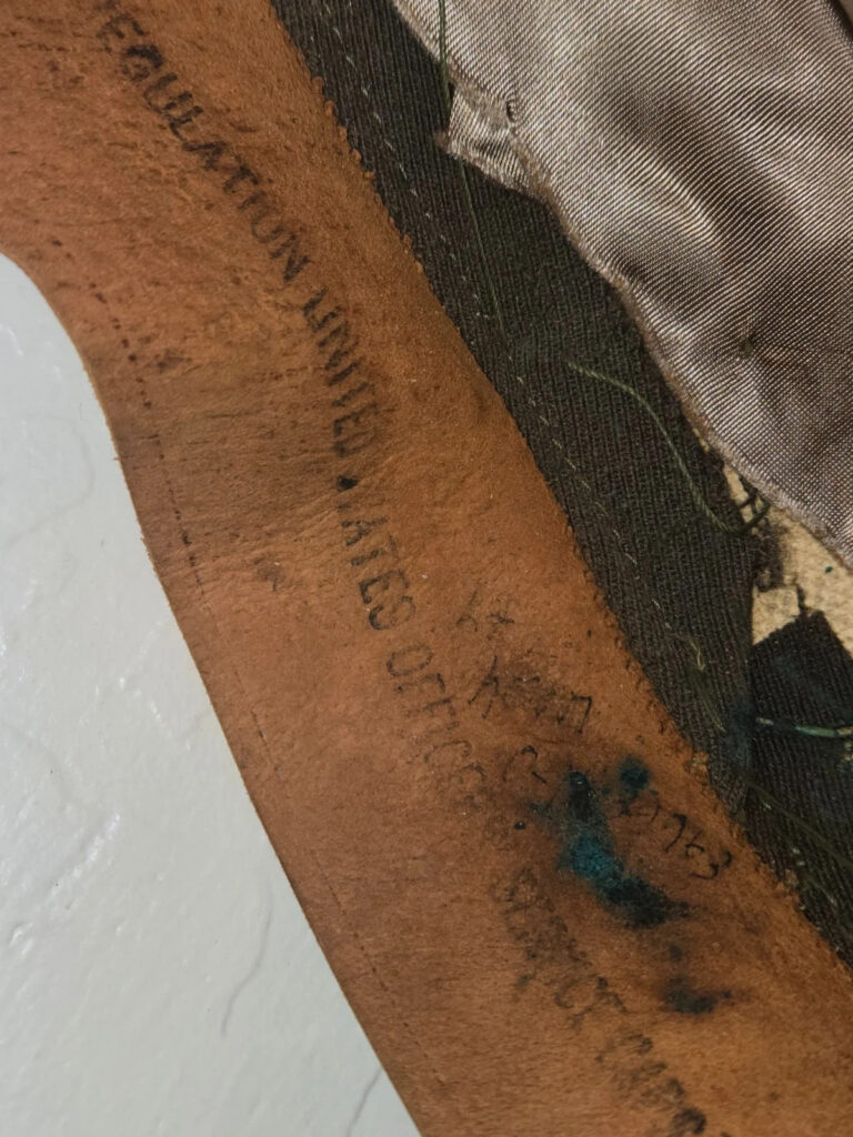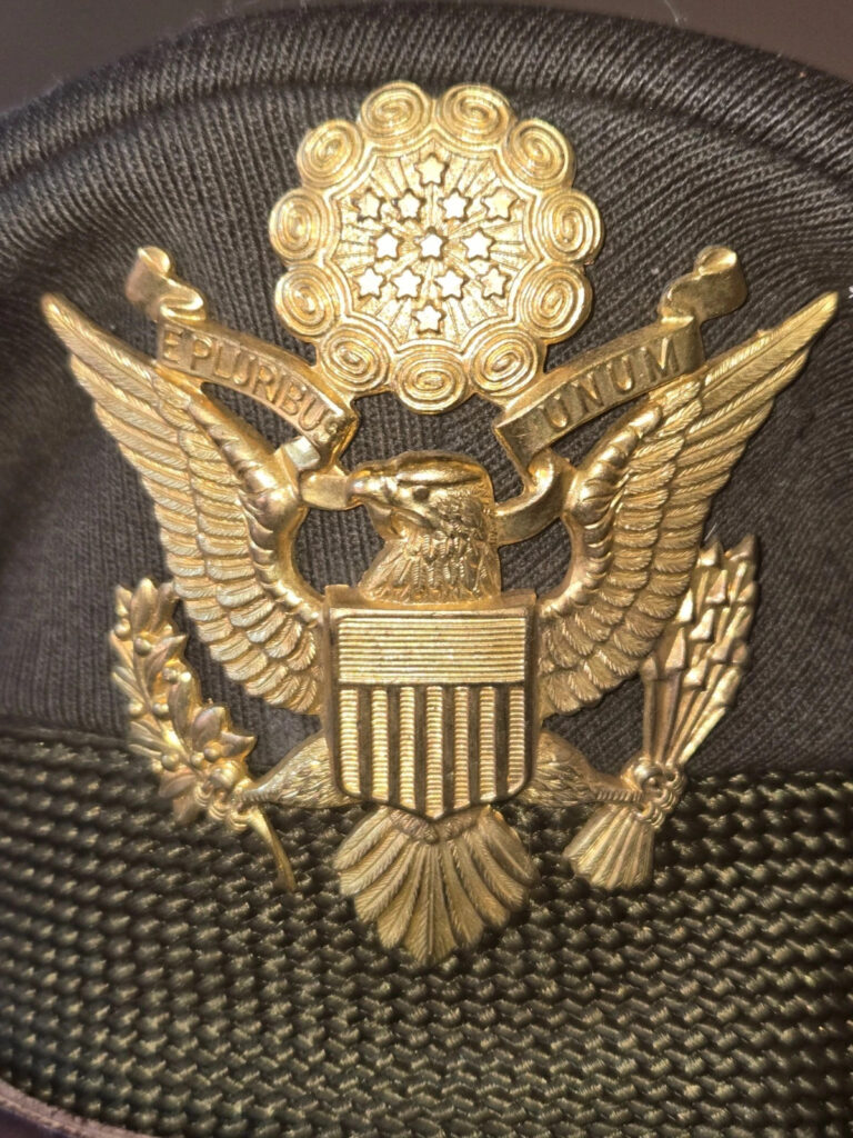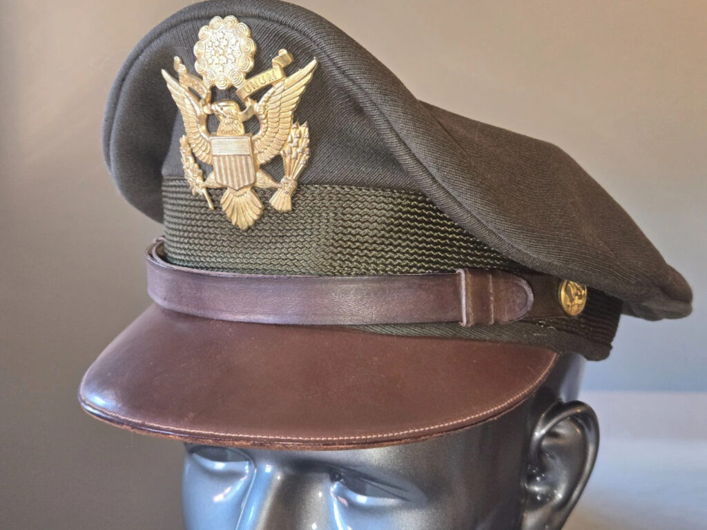 Named Crusher cap, manufacture date 1942 and attributed to B-17 navigator Lt. Kern (went on to Major General). The cap is labeled “Capt. Kern” in the crown, but inside the sweatband is “Lt. Kern”. Photos above show his B-17 “Revel’s Revenge” (sometimes noted as “Reuel’s Revenge”) and a photo of some of the POWs at Stalag Luft I near Barth Germany where he was taken. I’m not 100% on the attribution.