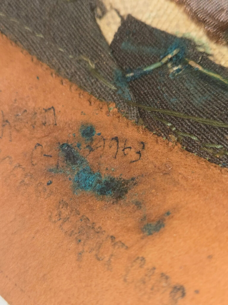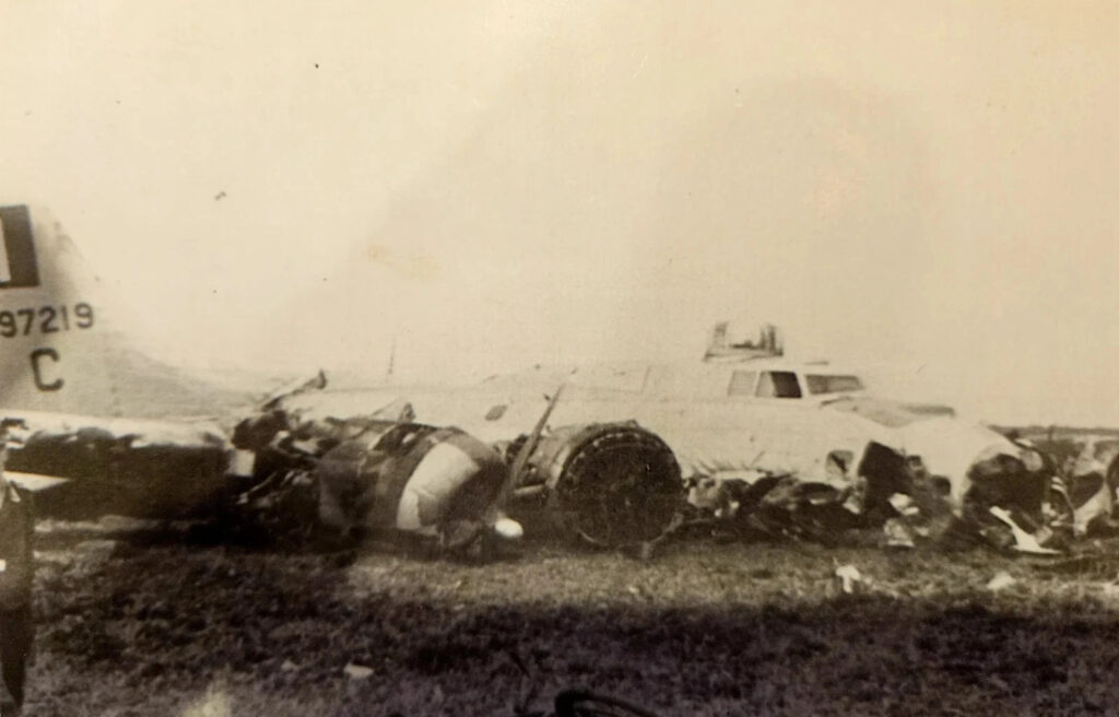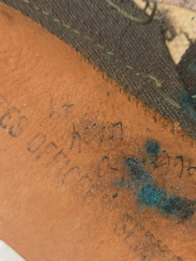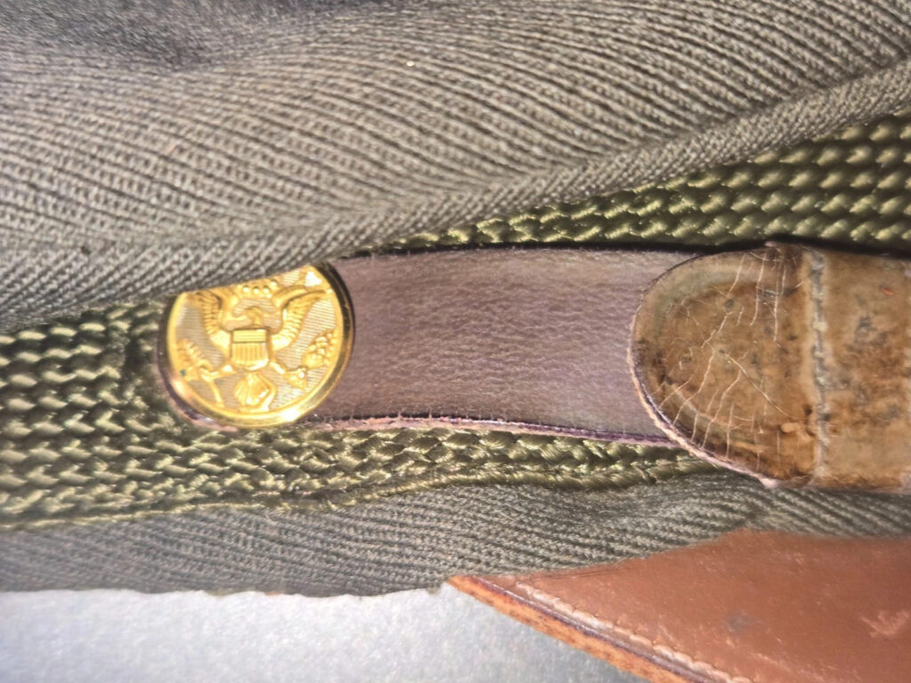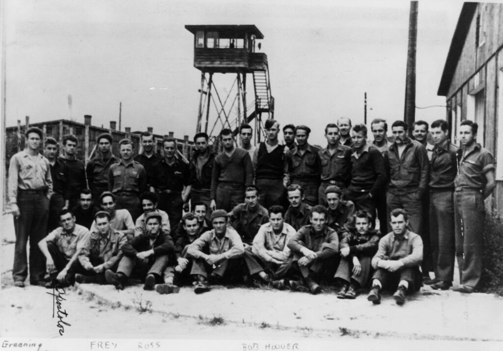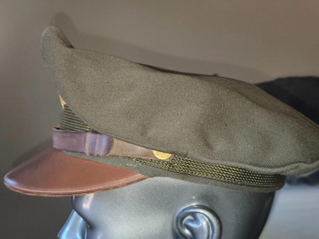 Named Crusher cap, manufacture date 1942 and attributed to B-17 navigator Lt. Kern (went on to Major General). The cap is labeled “Capt. Kern” in the crown, but inside the sweatband is “Lt. Kern”. Photos above show his B-17 “Revel’s Revenge” (sometimes noted as “Reuel’s Revenge”) and a photo of some of the POWs at Stalag Luft I near Barth Germany where he was taken. I’m not 100% on the attribution.